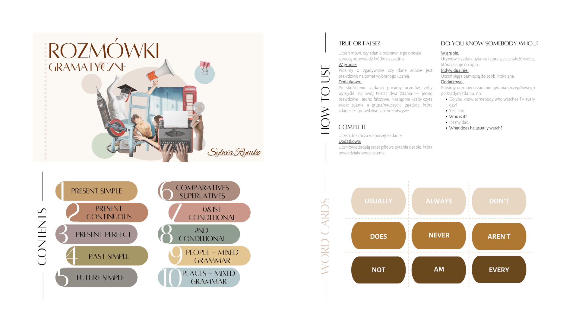 W ebooku Rozmówki gramatyczne znajdziesz gotowe zadania, które pomogą Ci przeprowadzić dynamiczne i ciekawe lekcje konwersacyjne oparte na gramatyce oraz pomysły na ich użycie.