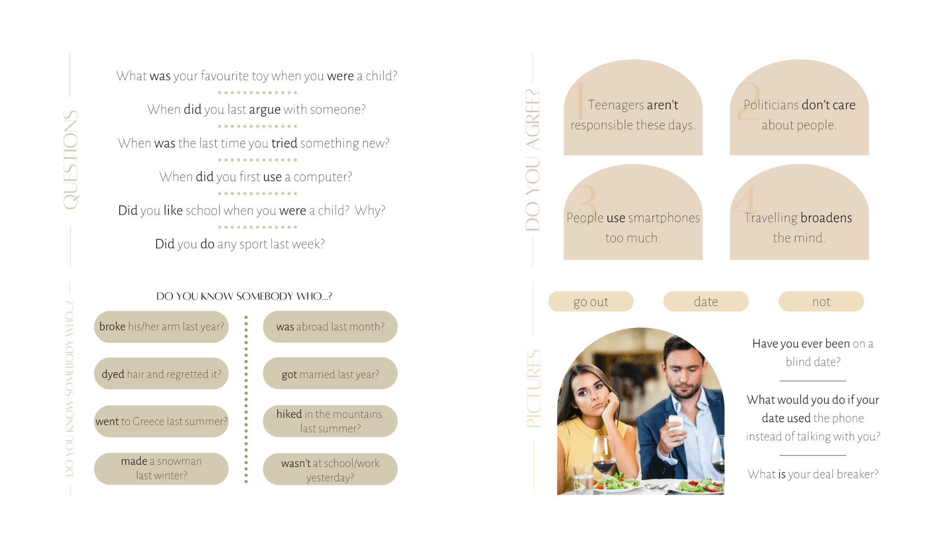 Rozmówki Gramatyczne to ebook ćwiczący gramatykę poprzez konwersacje. Świetnie sprawdzi się z kursantami na poziomie A2-B1+ na zajęciach online i offline.