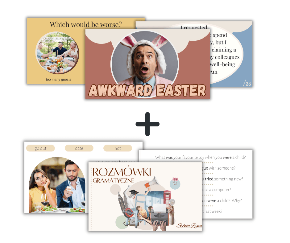 Kupując zestaw materiałów otrzymasz: Ebook Rozmówki Gramatyczne (szczegółowy opis tu) Ebook Awkward Easter (szczegółowy opis tu) Produkt w wersji elektronicznej (pdf). Ebooki możesz pobrać trzy razy. Nie przekazuj nikomu swojego linku.